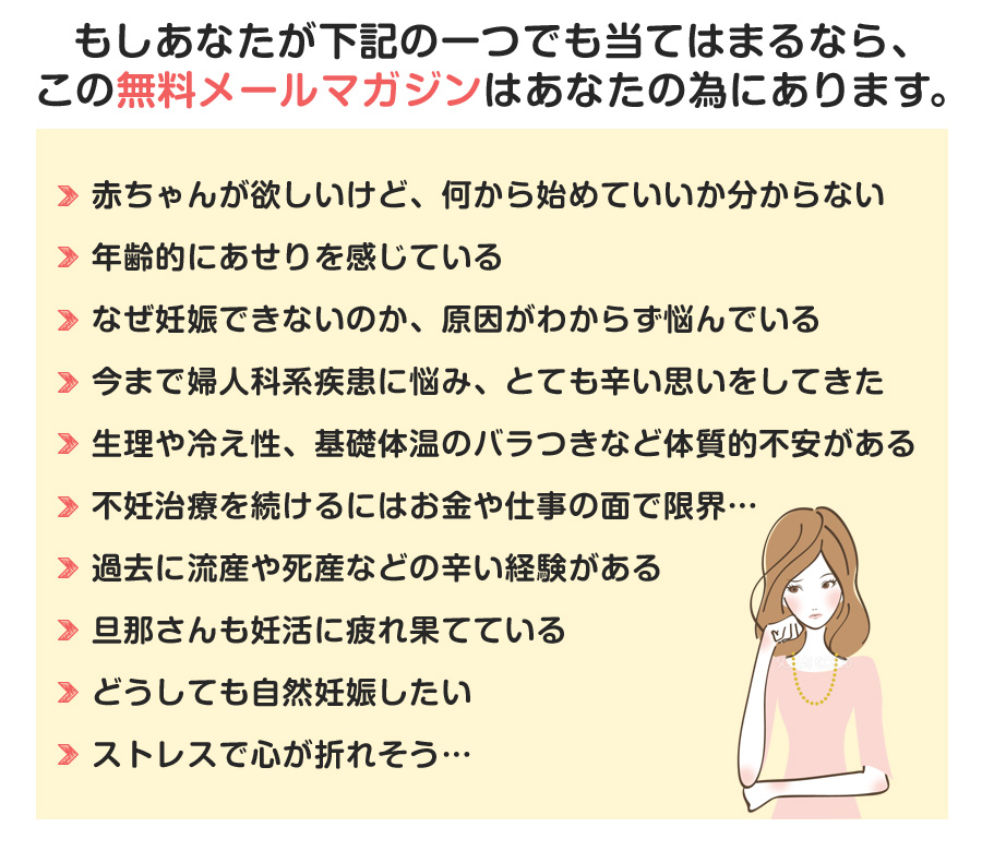 その具体的な方法をこれまでの臨床結果や実際の赤ちゃんを授かった方の声なども紹介しながら、分かりやすく順を追ってお伝えしていきますので、ぜひ無料メールマガジンに登録いただき、あなたも『妊娠体質』を手に入れて欲しいと願っています。
